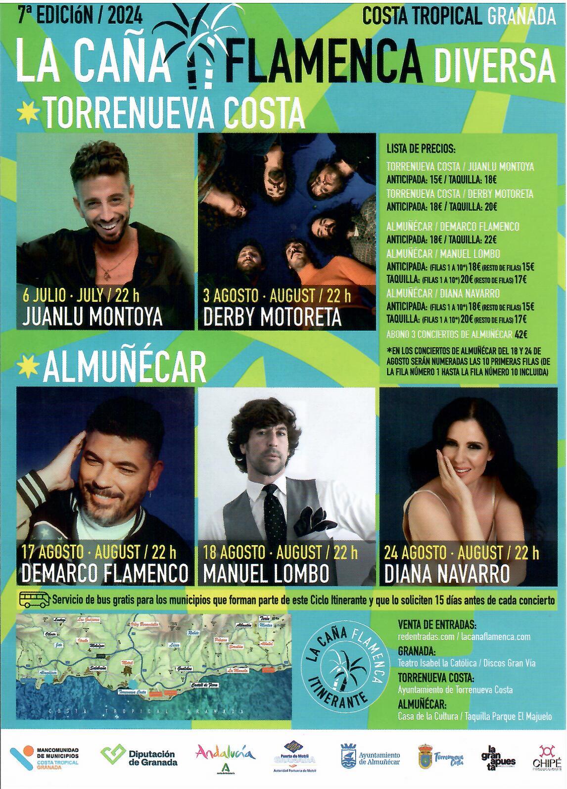Del 6 de julio al 24 de agosto los municipios de Torrenueva Costa y Almuñécar acogerán los conciertos de Juanlu Montoya (Torrenueva 6 julio), Derbi Motoreta (Torrenueva 3 agosto), Demarco Flamenco (Almuñécar 17 agosto), Manuel Lombo (Almuñécar 18 agosto) y Diana Navarro (Almuñécar 24 agosto).